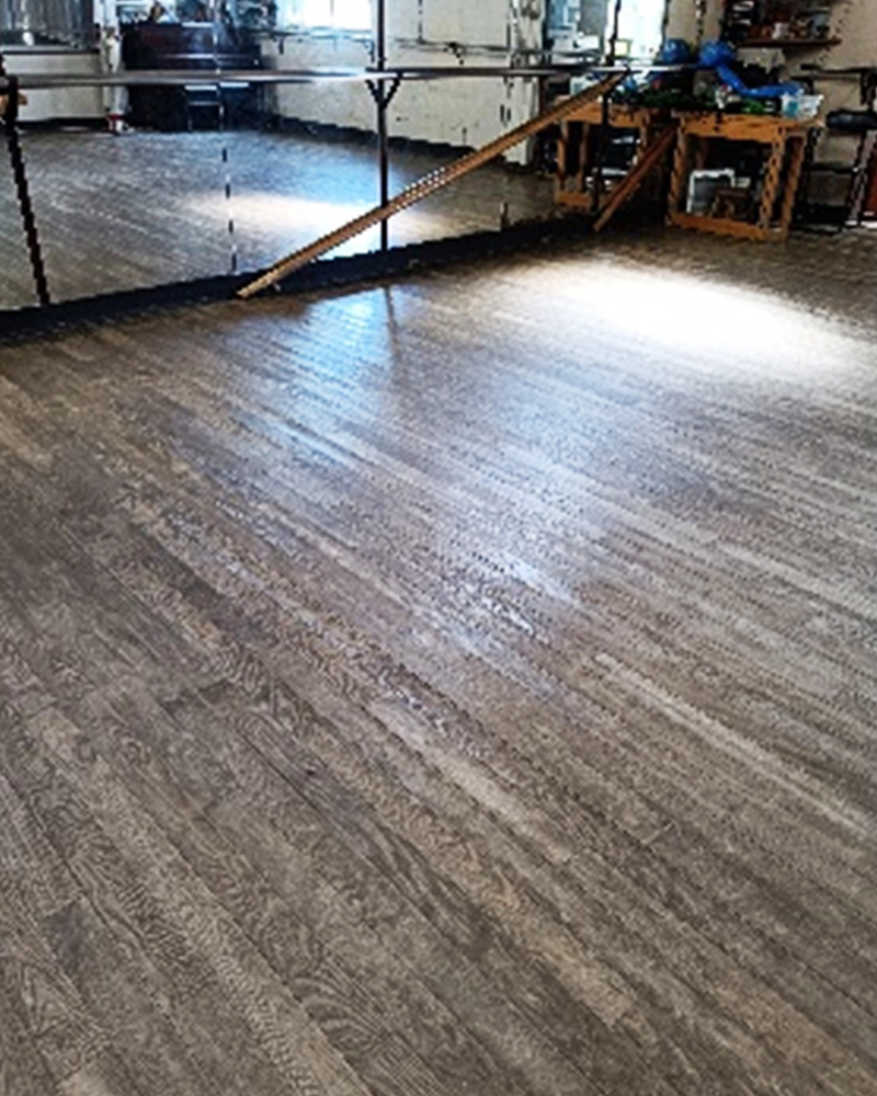 真向かいは緑豊かな公園、スタジオは天井が高く、床はバレエに最適な上質の木を使用。